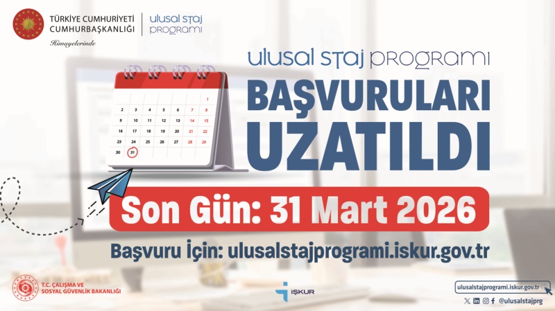 Cumhurbaşkanlığı Himayelerinde Türkiye İş Kurumu (İŞKUR) koordinasyonunda 2026 yılı “Ulusal Staj Programı” öğrenci başvuruları 06 Ocak 2026 tarihinde başlamış olup 31 Mart 2026 tarihi saat 23:59’a kadar devam edecektir.