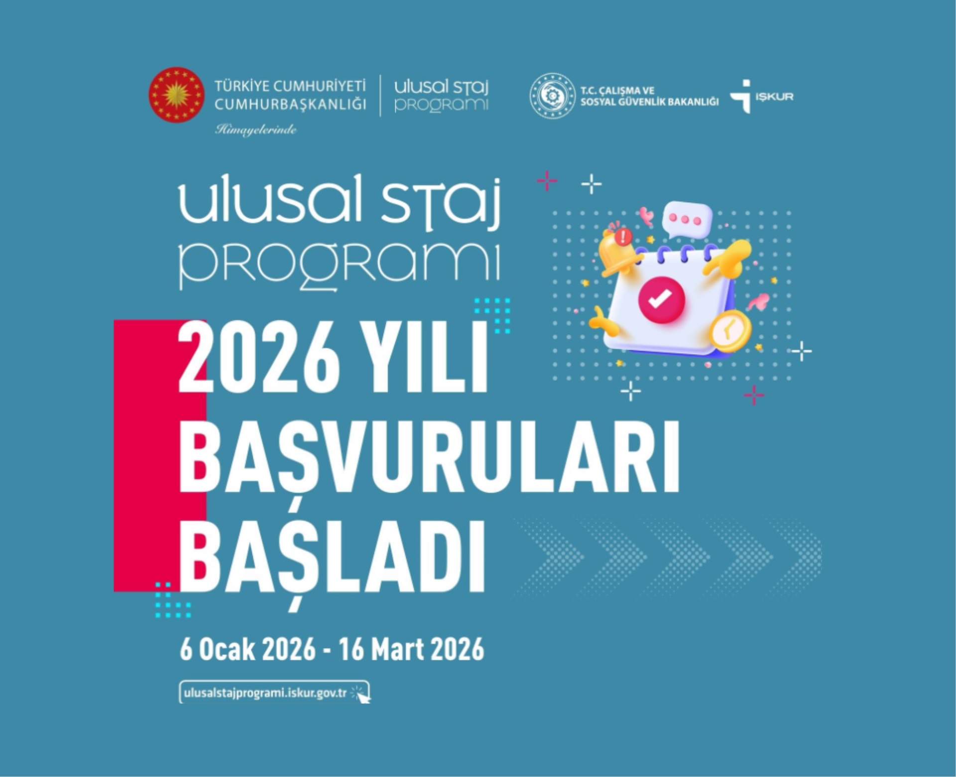 Cumhurbaşkanlığı Himayelerinde Türkiye İş Kurumu (İŞKUR) koordinasyonunda 2026 yılı “Ulusal Staj Programı” öğrenci başvuruları 06 Ocak 2026 tarihinde başlamış olup 16 Mart 2026 tarihine kadar devam edecektir.